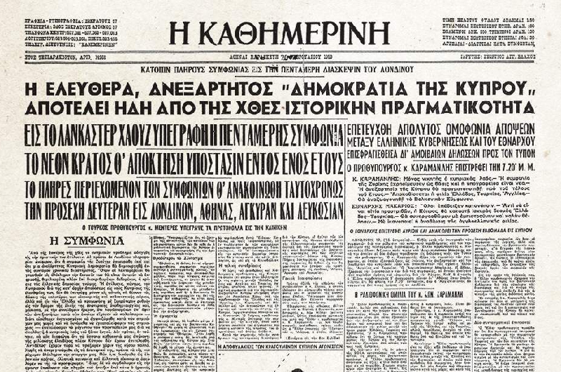 Ήταν τον Φεβρουάριο του 1959 όταν, μετά τον τετραετή ένοπλο αγώνα της ΕΟΚΑ για απαλλαγή από τη βρετανική αποικιοκρατία, αυτοδιάθεση της Κύπρου και ένωση με την Ελλάδα, ο πρωθυπουργός της Ελλάδας Κωνσταντίνος Καραμανλής και ο πρωθυπουργός της Τουρκίας Αντνάν Μεντερές υπέγραψαν στη Ζυρίχη κείμενο με τους όρους της δημιουργίας της ανεξάρτητης κυπριακής δημοκρατίας. Διαβάζω πως υπέγραψαν και κάτι άλλες μυστικές συμφωνίες βάσει των οποίων Ελλάδα και Τουρκία θα στήριζαν την ένταξη της Κύπρου στο ΝΑΤΟ και θα ζητούσαν την απαγόρευση του Κομμουνιστικού Κόμματος, κάτι που άλλωστε Βρετανοί και Αμερικανοί συστηματικά φρόντιζαν και σε άλλες χώρες της επιρροής τους, όταν ο κόσμος ξαναμοιράστηκε μετά το τέλος του Β΄ Παγκοσμίου Πολέμου.