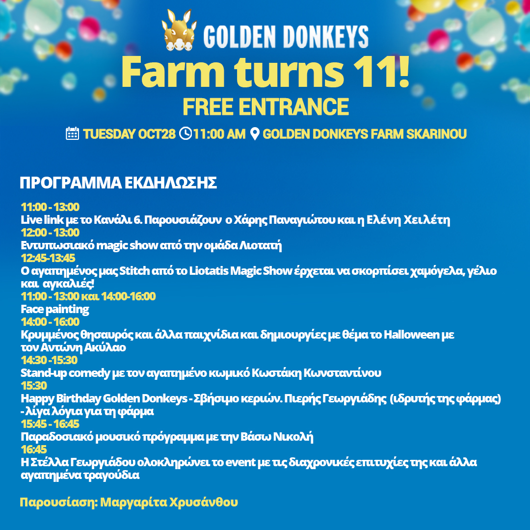 Σας περιμένουμε να γιορτάσουμε μαζί τα 11 γενέθλια της Golden Donkeys Farm σε ένα αξέχαστο event, παρέα με τα αγαπημένα μας γαϊδουράκια αλλά και πολλές εκπλήξεις!