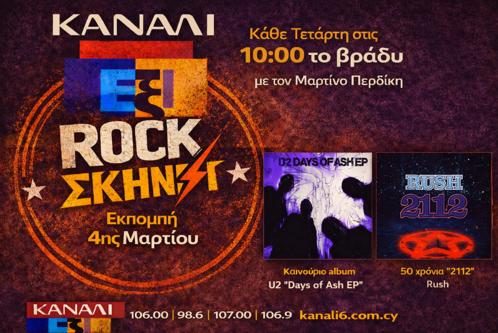 Αυτή την Τετάρτη, 4 Μαρτίου, παρουσιάζουμε το καινούριο EP του θρυλικού ιρλανδικού rock συγκροτήματος U2 που φέρει τον τίτλο Days of Ash, εγκαινιάζουμε το ένθετο για τον μήνα Μάρτιο στο οποίο ακούμε τις ζωντανές ηχογραφήσεις των Yes, που έγιναν πριν από 30 χρόνια μετά την επανένωση της κλασικής σύνθεσης της μπάντας όπως κυκλοφόρησαν στη συλλογή Keys to Ascension, ενώ στη δεύτερη ώρα παρουσιάζουμε το 50χρονο κλασικό album 2112 του Καναδέζικου προοδευτικού ροκ συγκροτήματος Rush.