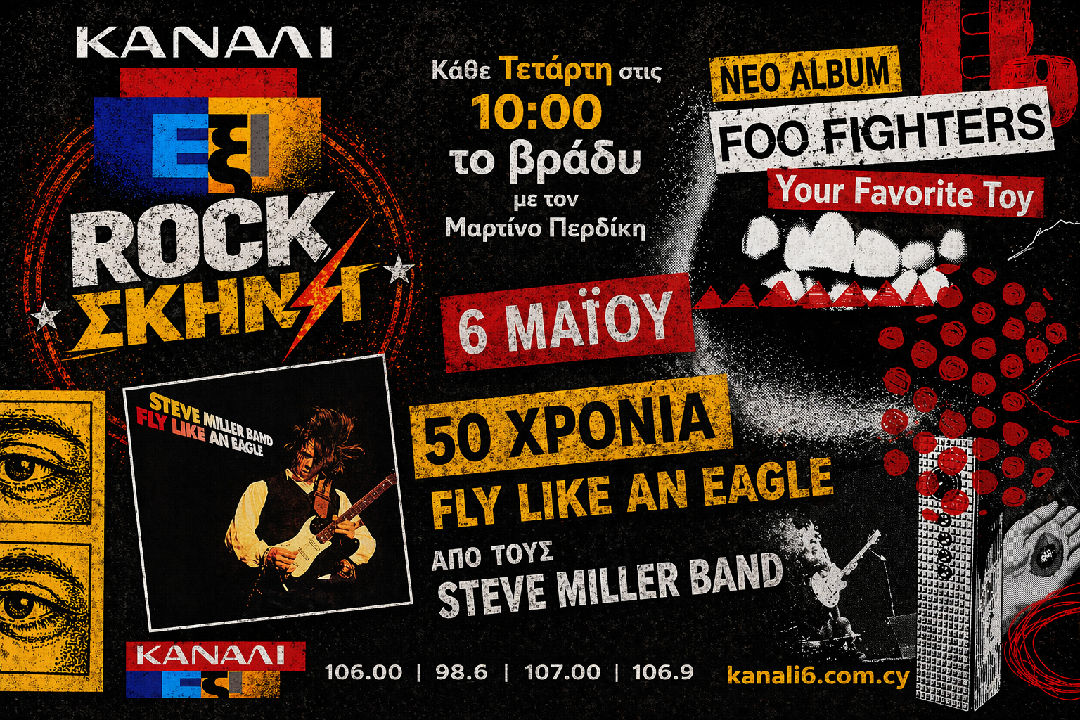 Αυτή την Τετάρτη, 6 Μαΐου, η Rock Σκηνή παρουσιάζει το καινούριο album του αμερικανικού συγκροτήματος του Dave Grohl, Foo Fighters που φέρει τον τίτλο Your Favorite Toy, συνεχίζει το ένθετο για τους μήνες Απρίλιο και Μάιο στο οποίο ακούγεται το πρόσφατο live album του Steven Wilson, Impossible Tightrope: Live in Madrid, ενώ στη δεύτερη ώρα παρουσιάζει το 50χρονο κλασικό album των Steve Miller Band, Fly Like an Eagle.