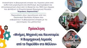 Το Εμπορικό και Βιομηχανικό Επιμελητήριο Λεμεσού διοργανώνει αυτό το Σάββατο 1 Νοεμβρίου 2025, από τις 10 το πρωί έως την μία μετά το μεσημέρι, την εκδήλωση με τίτλο «Μνήμες, Μηχανές και Καινοτομία: Η Βιομηχανική Λεμεσός από το Παρελθόν στο Μέλλον», στους χώρους του ΕΒΕ Λεμεσού στη Λεωφ. Φραγκλίνου Ρούσβελτ. Οι…