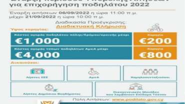 Το Υπουργείο Μεταφορών, Επικοινωνιών και Έργων ανακοινώνει την έναρξη υποβολής αιτήσεων για το αναθεωρημένο Σχέδιο Επιχορήγησης για αγορά ποδηλάτου για την περίοδο 2022 – 2023. Η περίοδος υποβολής αιτήσεων είναι από τις 06/09/2022 ώρα 11:00 π.μ. μέχρι τις 21/09/2022 ώρα 10:00 π.μ.. Οι αιτήσεις θα πρέπει να υποβάλλονται διαδικτυακά στο…